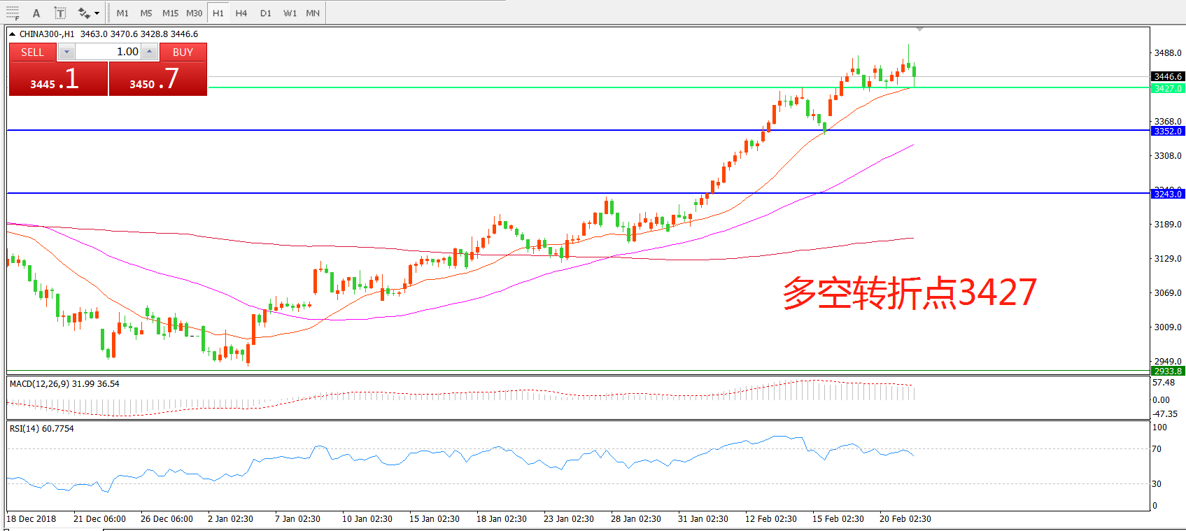 小时图看,CHINA300中华指数冲高后小幅回落。但整体依然位于支撑之上。均线系统呈多头排列, MACD红柱走平,整体维持偏多思路。