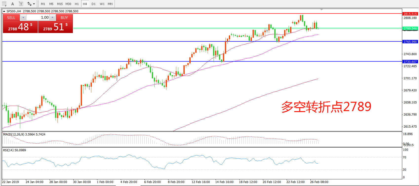 4小时图看,SP500高位震荡后依然呈现上升趋势,21均线成为下方短线支撑,MACD红柱减少,RSI指标掉头,短期有回调风险,但整体依然维持多头思路。