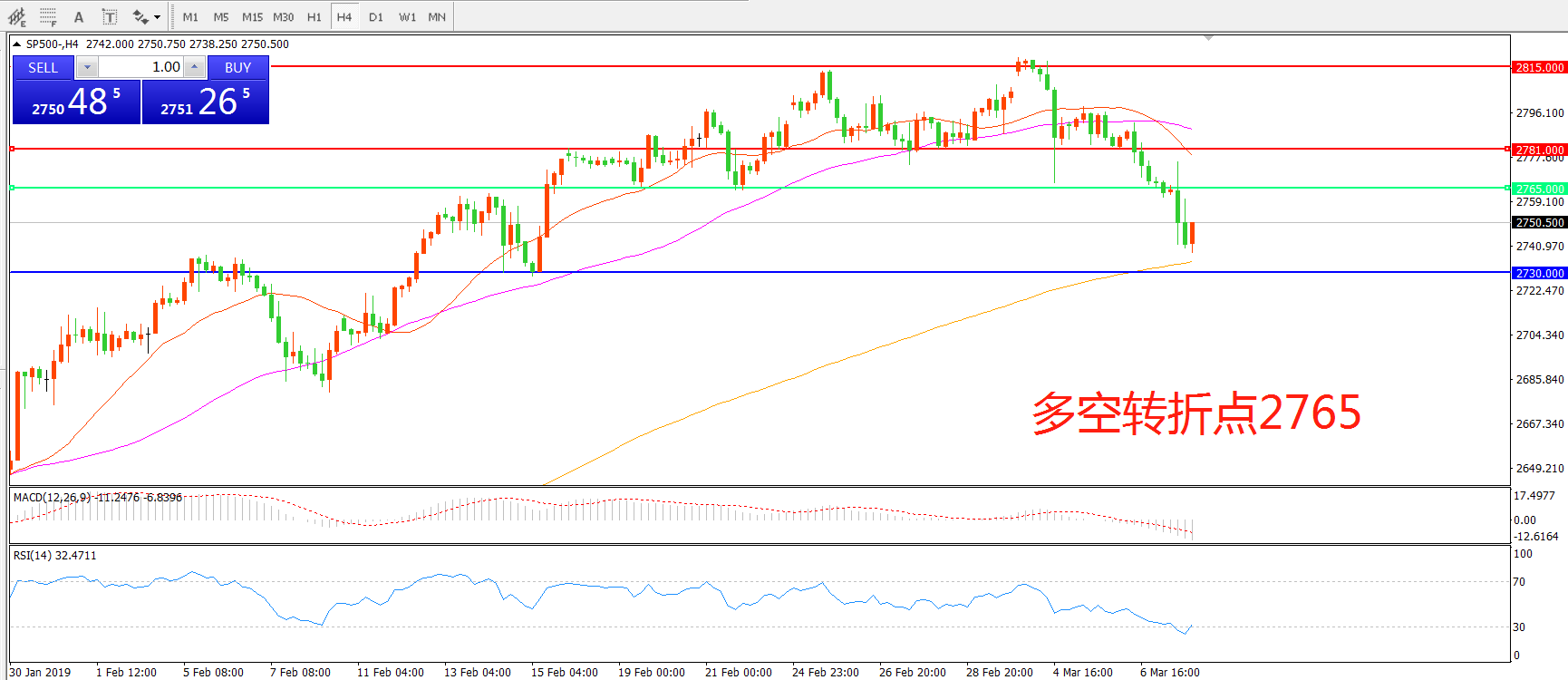 4小时图看,标普500跌破2781支撑后连续下行,形态上呈现空头走势,均线系统拐头向下,MACD绿柱增加,日内延续下行走势概率较大。