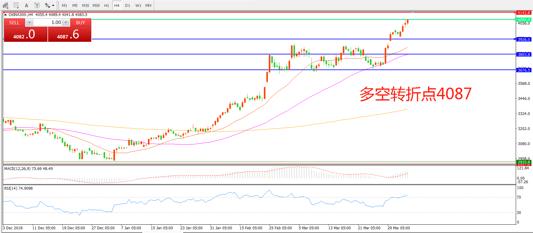 4小时图看,中华指数CHINA300以55均线为依托,连续上行,整体走势偏强。 MACD红柱增加,RSI指标拐头,多头趋势依然明显,开盘后延续上升概率较大。
