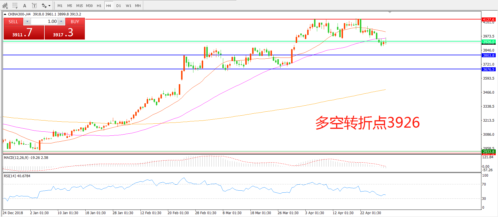4小时图看,沪深300指数延续震荡下行走势,21均线逐渐下压,55均线成为短期阻力,MACD红柱减少,RSI指标向下,重点关注3926一线的争夺情况。