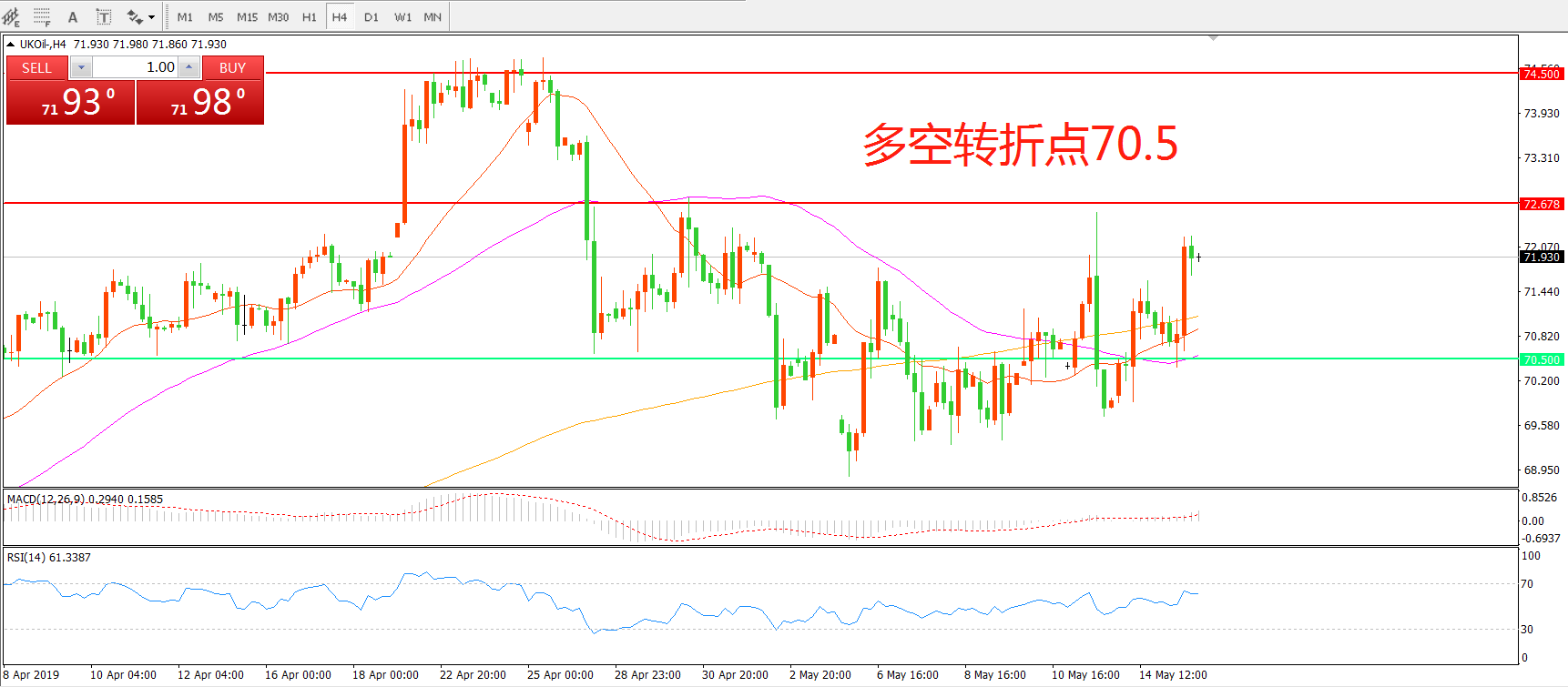 4小时图看,油价经过整理后长阳上升,整体走势企稳,短期均线拐头向上,日内延续震荡的概率较大,重点关注72.50一线得失