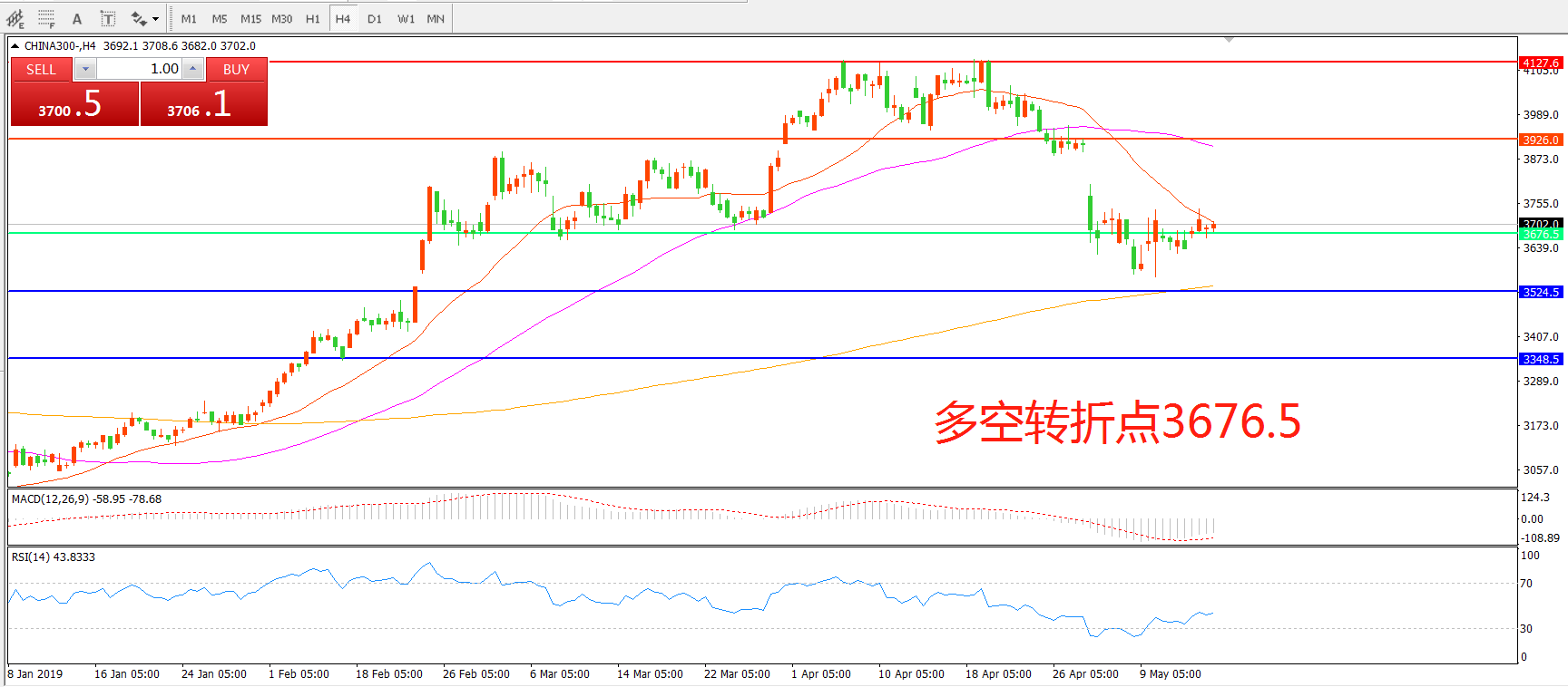 4小时图看,沪深300指数在3676.5附近企稳, 短期均线有拐头迹象,MACD绿柱缩短,RSI指标拐头向上,日内震荡上行概率较大