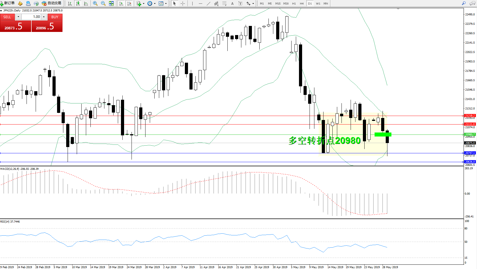 日经指数触及两周低位,因持续的中美贸易摩擦导致投资者看衰对中国有较大曝险的企业。金融股亦下跌,因中美贸易战对全球经济增长影响的风险,导致美国公债收益率跌至2017年9月以来最低。日经指数N225收跌1.21%至21,003.37点,盘中一度跌至20,884.61点,为5月14日以来最低水准。国际投资人大概已经决定出脱风险资产,因为美中贸易战的情况没有改变,全球债券收益率下滑令市场感到不安。