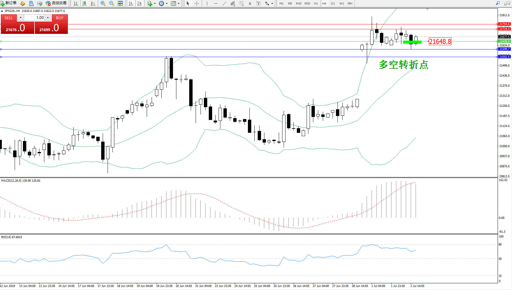 日经225指数7月2日(周二)收盘下跌5.97点,跌幅0.03%,报21724.00点。全球主要风险资产皆强劲反弹,G20峰会达成多项共识,提振市场情绪。日本短观调查证明日本非制造业领域经济强健。资本支出计划强劲,支撑需求。