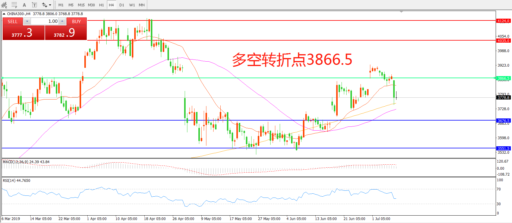 4小时图看,沪深300指数近期长阴下破后无力反弹,整体走势偏弱,但长期均线系统依然成为下方支撑,MACD红柱缩短,RSI指标走平,日内延续震荡概率较大。