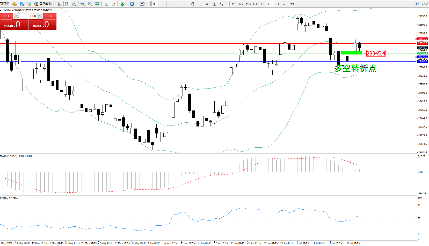 香港恒生指数7月11日(周四)收盘上涨227.11点,涨幅0.81%,报28431.80点;恒指夜期咋晩受惠联储局主席暗示月底减息之利好消息,曾大幅造好,最多升253点。早上高开143点,随后再逐步扩大升幅,最多升378点,高见28582,续在高位横行至收市。恒指虽见造好,但原因也是憧憬减息吧。而成交金额偏低,未能配合升势。