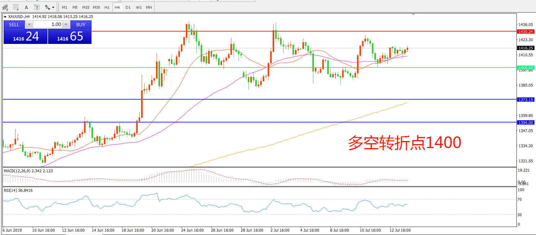 7月15日上午,中国国家统计局公布多项宏观经济数据,2019年上半年国民经济运行继续保持在合理区间,延续总体平稳、稳中有进的发展势头,美国方面公布的经制造业指数也好于预期。中美数据的回暖缓解了近期以来的经济放缓担忧,金价整体呈现震荡走势,最终收报1417.00 美元/盎司。