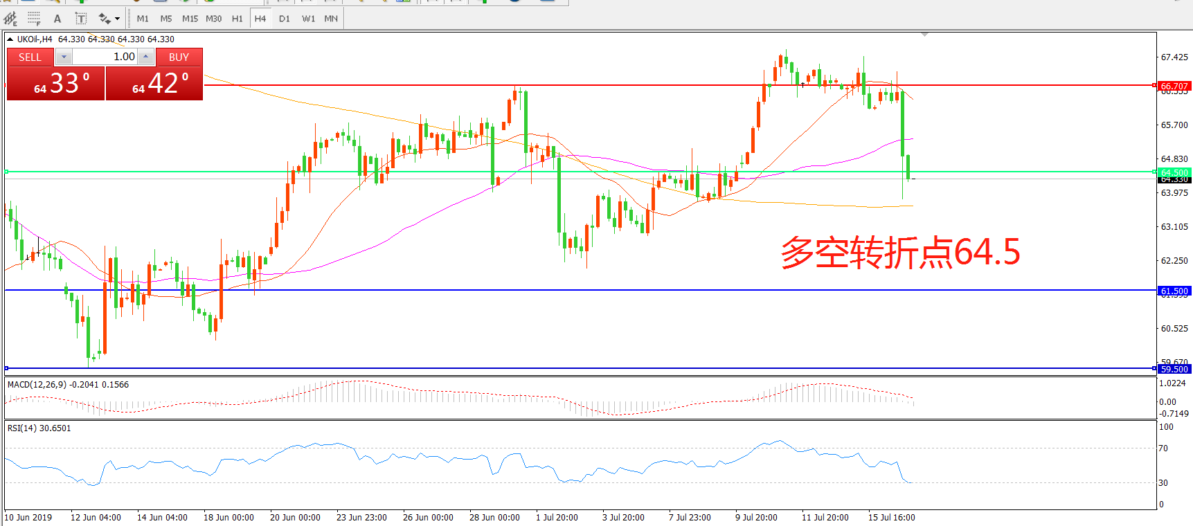 4小时图看,油价长阴破位,无力收复,短期走势偏弱,64.5成为短期多空分水岭,短期均线出现拐头, MACD绿柱增加, RSI指标拐头走平,日内延续下行概率较大,重点关注晚间EIA库存数据表现。
