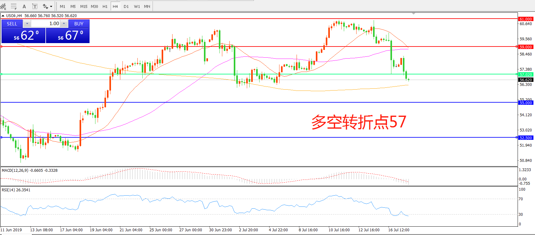 北京时间周三(7月17日)22:30,美国能源信息署公布的数据显示,美国当周除原油库存减少311.6万桶,好于预期,但汽油与精炼油同步出现增长,成品油库存的增加反映了需求端的疲软,为该报告增加了利空基调。美油小幅拉升后掉头大跌,收报56.7美元/桶。