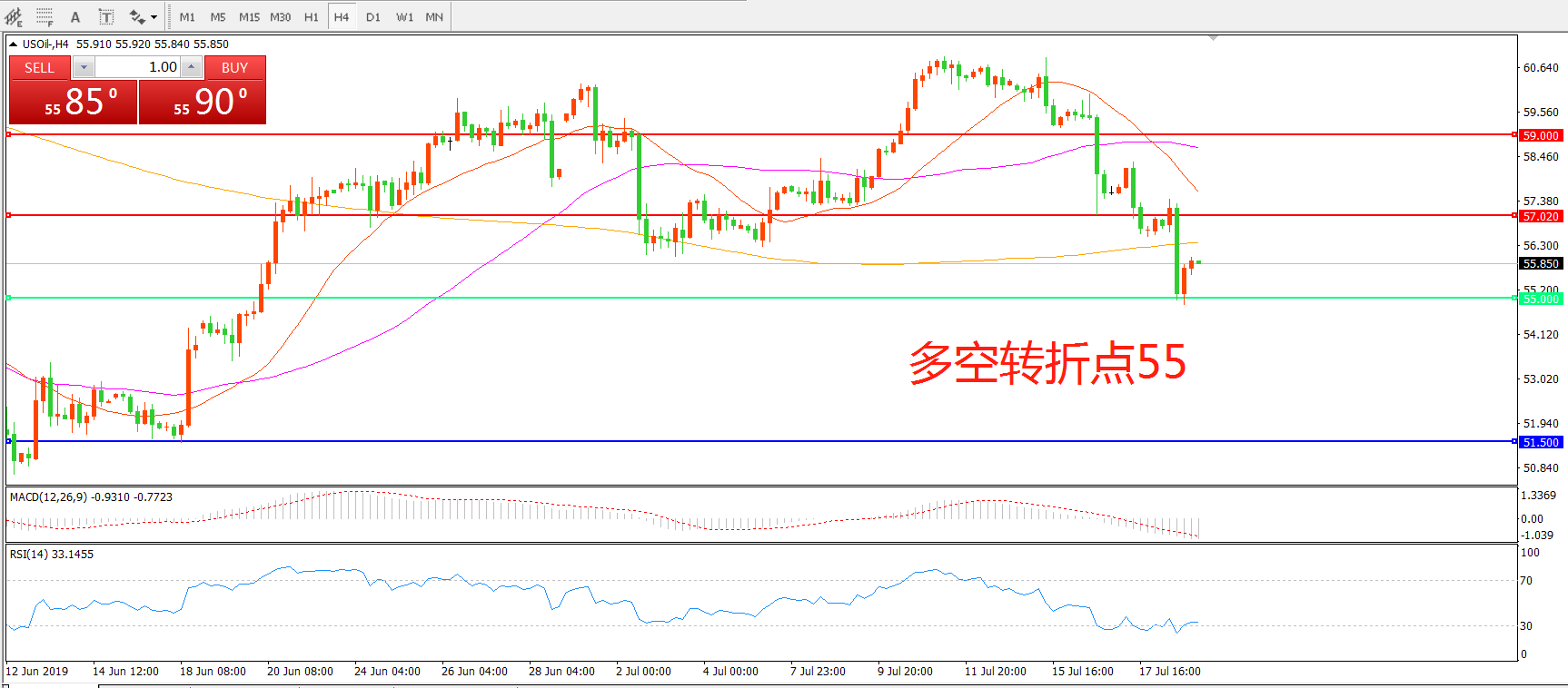 4小时图看,油价长阴破位,无力收复,短期走势偏弱,200周期均线形成上方阻力, RSI指标走平,55美金是油价较强支撑,连续下行的油价预计会在此展开整理。