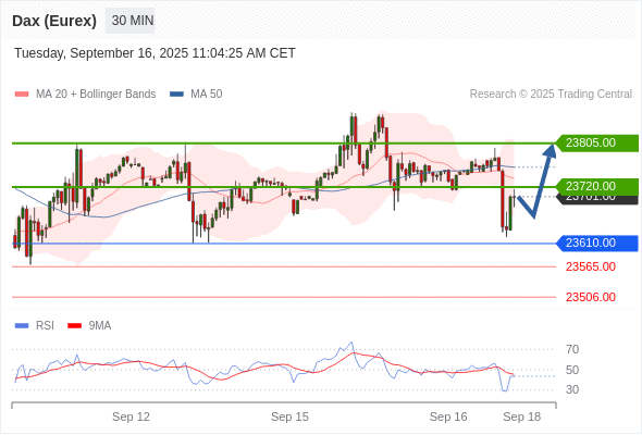 交易策略: 在 23610.00 之上,看涨,目标价位为 23720.00 ,然后为 23805.00 。
