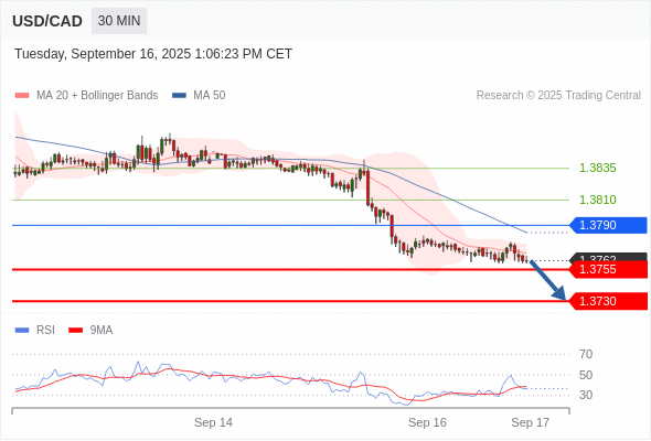 在 1.3790 之下,看跌,目标价位为 1.3755 ,然后为 1.3730 。