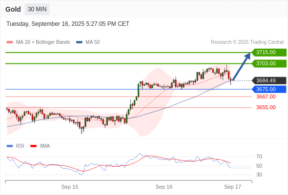 在 3675.00 之上,看涨,目标价位为 3703.00 ,然后为 3715.00 。
