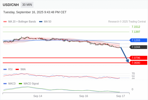 备选策略: 如突破 7.1203 ,USD/CNH 目标方向为 7.1397 和 7.1512 。