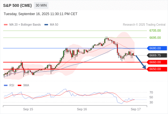 在 6680.00 之下,看跌,目标价位为 6660.00 ,然后为 6650.00 。