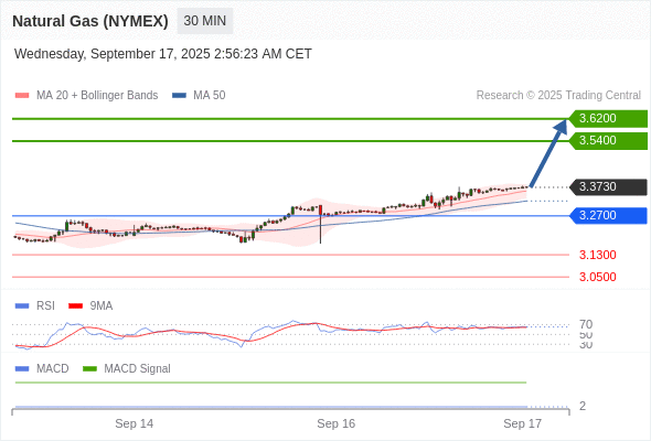 Natural Gas (NYMEX) (NOV5) 当日内: 看涨,当 3.2700 为支撑位,目标定在3.6200。
