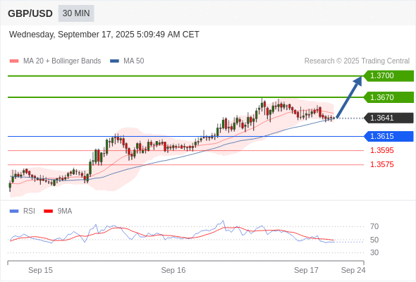 在 1.3615 之上,看涨,目标价位为 1.3670 ,然后为 1.3700 。