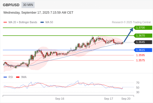 在 1.3615 之上,看涨,目标价位为 1.3670 ,然后为 1.3700 。