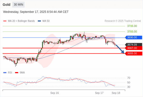 在 3690.00 之下,看跌,目标价位为 3667.00 ,然后为 3655.00 。