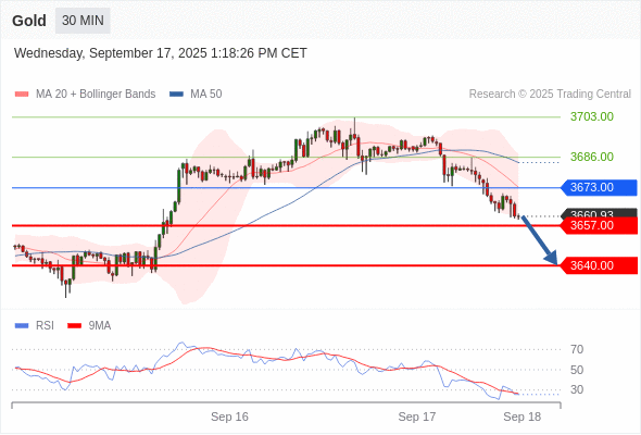 在 3673.00 之下,看跌,目标价位为 3657.00 ,然后为 3640.00 。