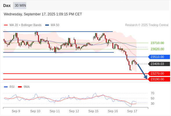 在 23510.00 之下,看跌,目标价位为 23270.00 ,然后为 23190.00 。