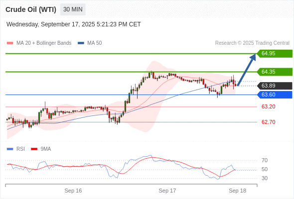 在 63.60 之上,看涨,目标价位为 64.35 ,然后为 64.70 。