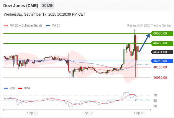 在 46240.00 之上,看涨,目标价位为 46460.00 ,然后为 46585.00 。