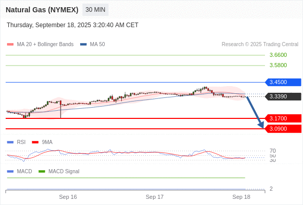 Natural Gas (NYMEX) (NOV5) 当日内: 看跌,当 3.4500 为阻力位。