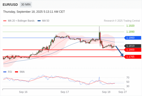 交易策略: 在 1.1860 之下,看跌,目标价位为 1.1800 ,然后为 1.1765 。