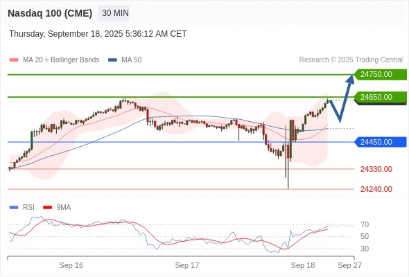 在 24450.00 之上,看涨,目标价位为 24650.00 ,然后为 24750.00 。