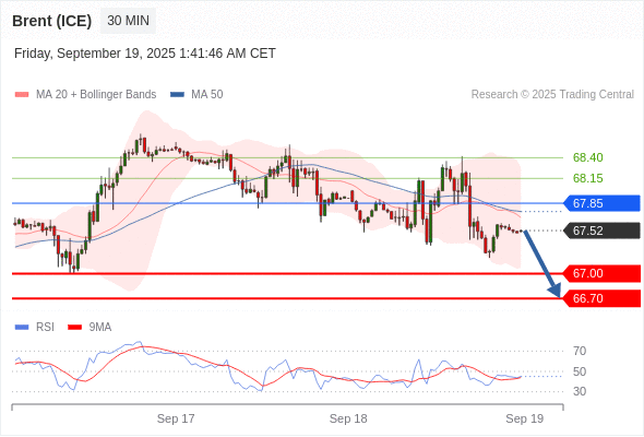 交易策略: 在 67.85 之下,看跌,目标价位为 67.00 ,然后为 66.70 。