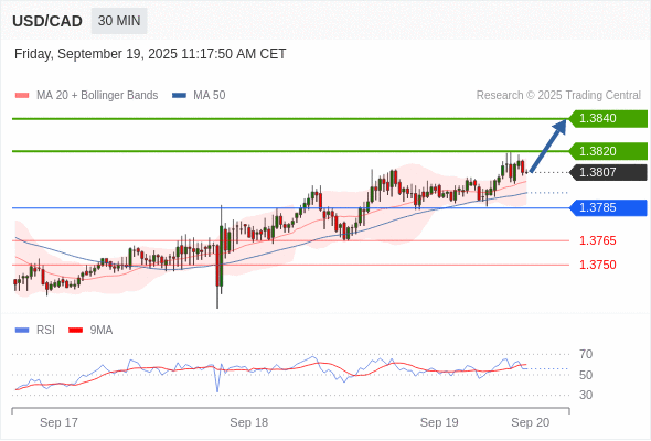 在 1.3785 之上,看涨,目标价位为 1.3820 ,然后为 1.3840 。