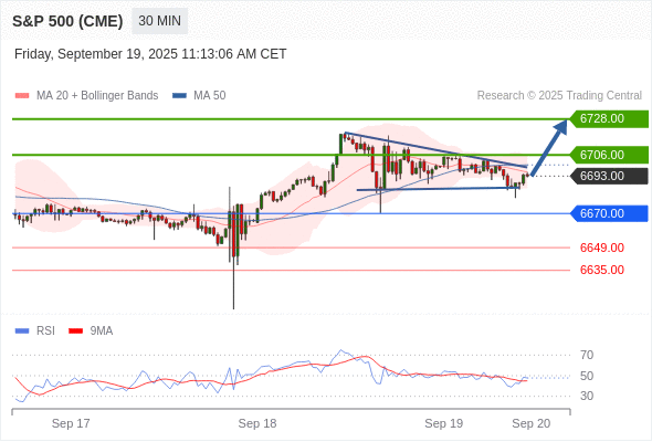 在 6670.00 之上,看涨,目标价位为 6706.00 ,然后为 6728.00 。