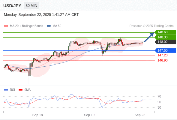 在 147.50 之上,看涨,目标价位为 148.30 ,然后为 148.60 。