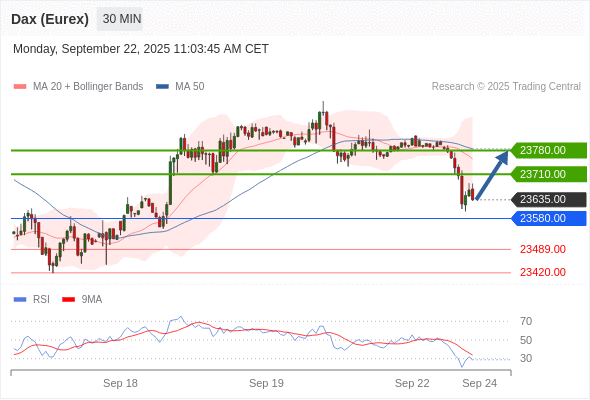 在 23580.00 之上,看涨,目标价位为 23710.00 ,然后为 23780.00 。