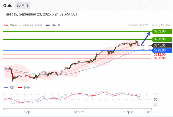 在 3725.00 之上,看涨,目标价位为 3760.00 ,然后为 3785.00 。
