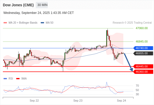 在 46740.00 之下,看跌,目标价位为 46445.00 ,然后为 46360.00 。
