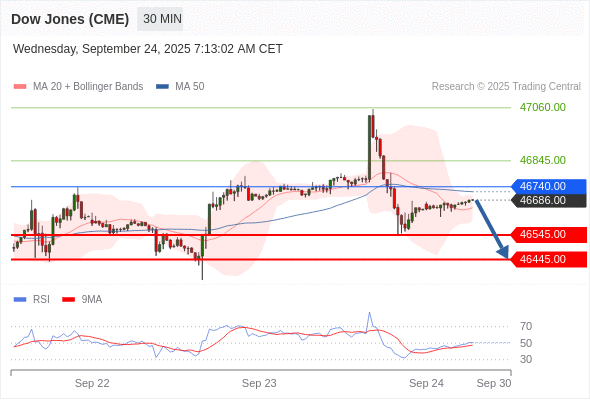 在 46740.00 之下,看跌,目标价位为 46545.00 ,然后为 46445.00 。