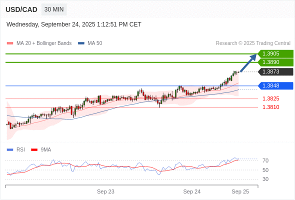 在 1.3848 之上,看涨,目标价位为 1.3890 ,然后为 1.3905 。