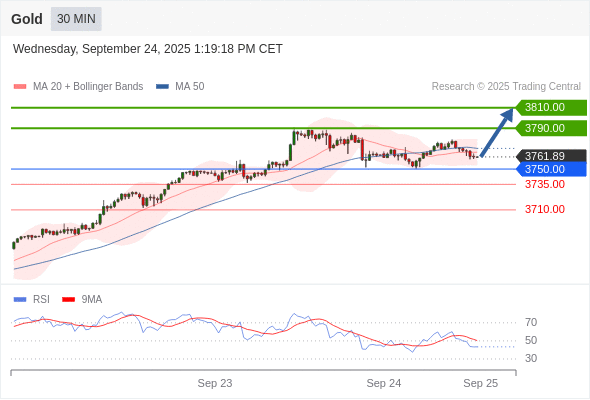 在 3750.00 之上,看涨,目标价位为 3790.00 ,然后为 3810.00 。