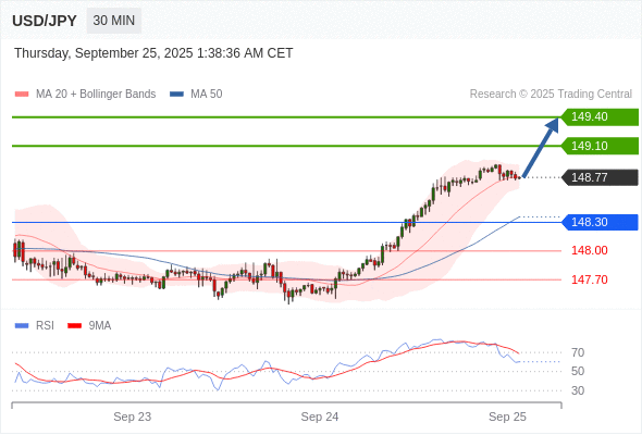 在 148.30 之上,看涨,目标价位为 149.10 ,然后为 149.40 。