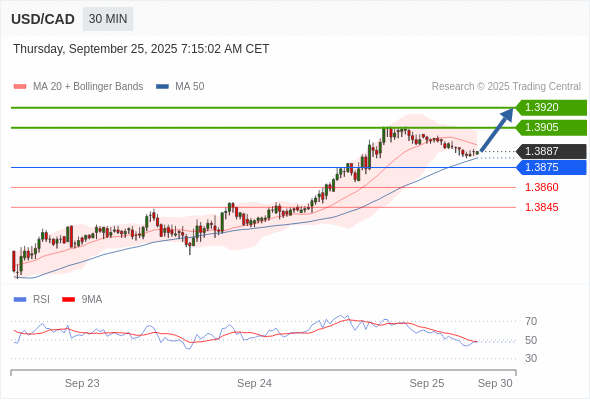 在 1.3875 之上,看涨,目标价位为 1.3905 ,然后为 1.3920 。