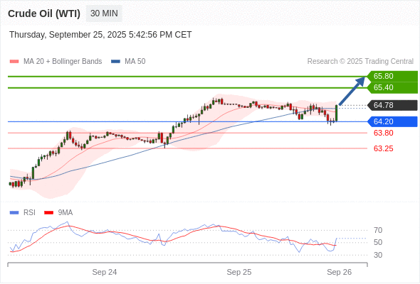 在 64.20 之上,看涨,目标价位为 65.40 ,然后为 65.80 。