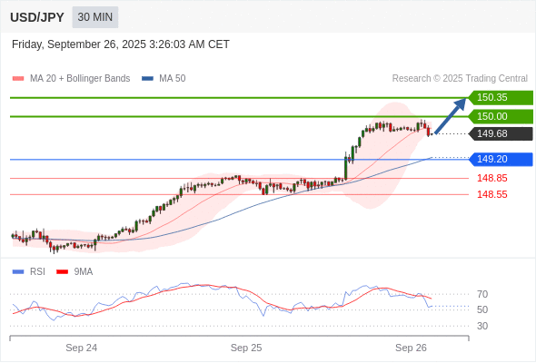 在 149.20 之上,看涨,目标价位为 150.00 ,然后为 150.35 。