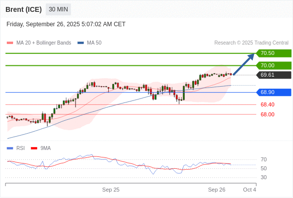 布伦特原油 (ICE) (X5) 当日内: 朝70.50运行。