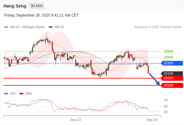 恒生指数 当日内: 下跌趋势。