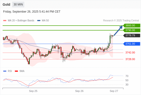 在 3761.00 之上,看涨,目标价位为 3790.00 ,然后为 3800.00 。