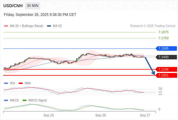 备选策略: 如突破 7.1565 ,USD/CNH 目标方向为 7.1759 和 7.1875 。