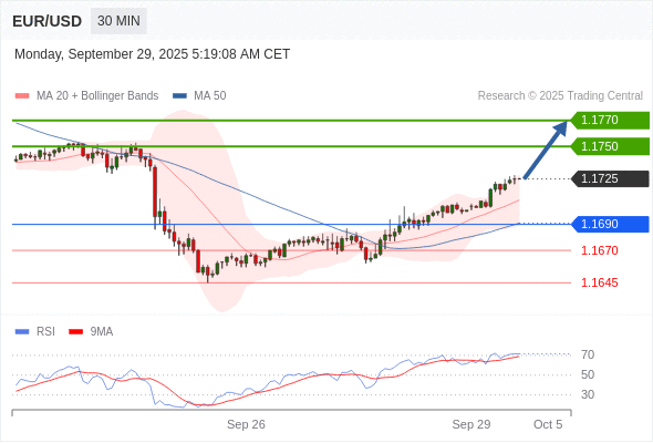 在 1.1690 之上,看涨,目标价位为 1.1750 ,然后为 1.1770 。